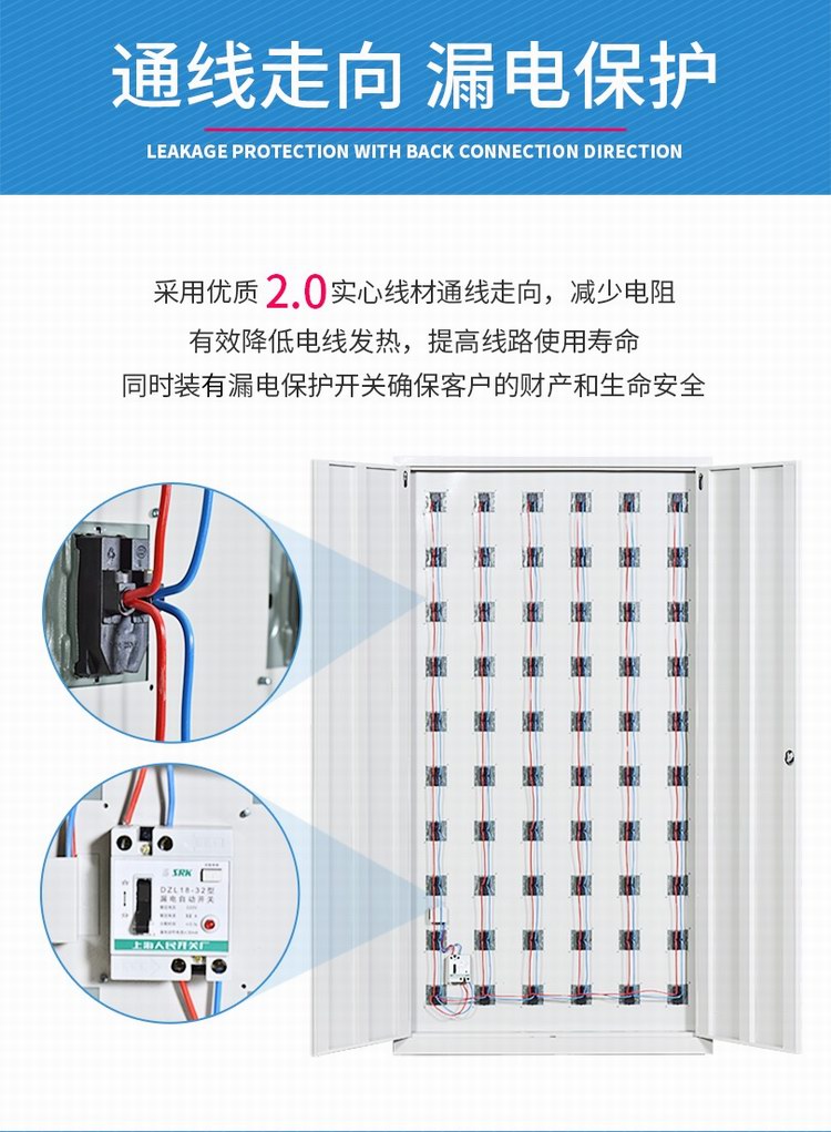 電源線全部采用2.5mm2實心線材,額定電壓為標準生活電壓220V,載荷電流為20A,負載功率為4400W。日常用手機充電功率為10-15W左右,可滿足290部(按15W計算)手機同時充電,而本手機柜可達到門數(shù)為100門,電源線材遠遠滿足充電需求;同時具有漏電保護功能,當(dāng)發(fā)生漏電時,能夠及時將電源切斷,保護充電設(shè)備安全,需手動復(fù)位方可通電,防止因漏電造成電子設(shè)備損壞。