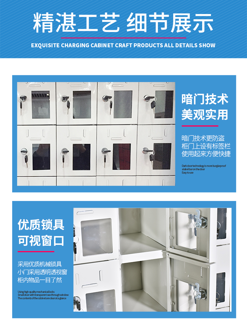小門設(shè)計(jì)單獨(dú)鎖具,單柜單開,可實(shí)現(xiàn)一人一鎖;上方設(shè)計(jì)標(biāo)簽卡槽,便于粘貼姓名銘牌等信息,方便識(shí)別與管理,右下部設(shè)計(jì)透明亞克力觀察窗,便于觀察手機(jī)存放情況;內(nèi)部采用暗門折邊設(shè)計(jì),有效防止刮手。